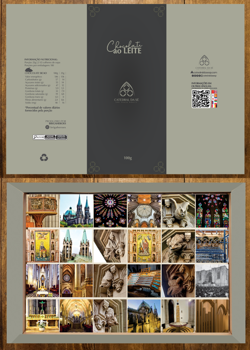 A embalagem apresenta imagens impressas em forma de mosaico fotográfico, compostas por registros dos próprios chocolates da coleção. Assim como os mosaicos da Catedral são formados por pequenas peças que, juntas, constroem uma obra grandiosa, os chocolates se organizam visualmente para criar uma composição que celebra unidade, equilíbrio e tradição.