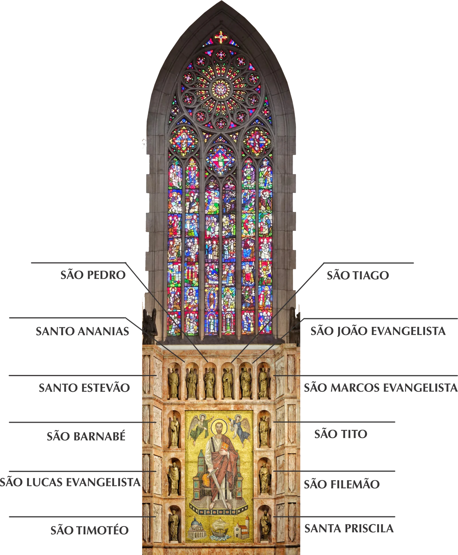 Os mosaicos são o simbolismo das trajetórias individuais dos Santos, assistidos por 12 [doze] figuras bíblicas [SANTOS E PONTÍFICES] que tiveram alguma relação com a pessoa e com o culto de cada um.